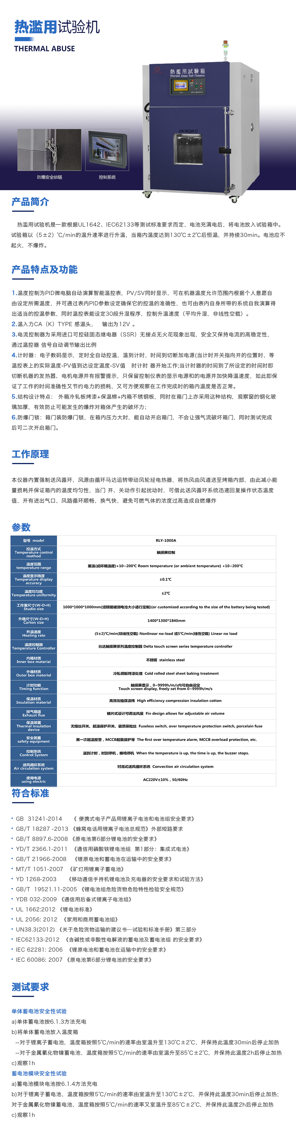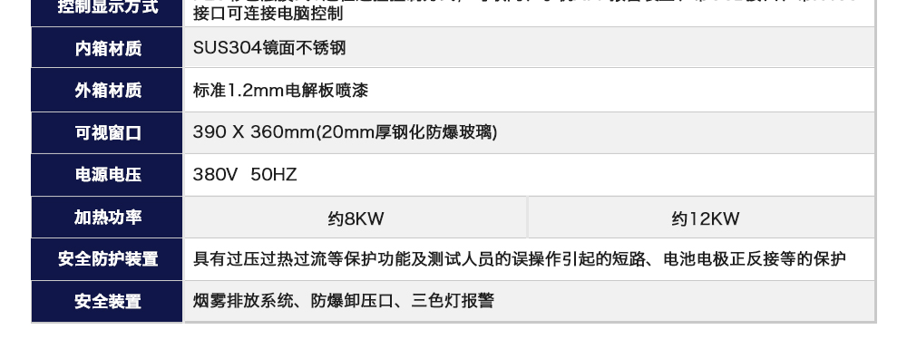 產品型號:JQ-101-512A 品牌:劍 喬 用途:熱濫用試驗箱是一款根據UL1642、IEC62133等測試標準要求而定,電池充滿電后,將電池放入試驗箱中。試驗箱以(5±2)℃/min的溫升速率進行升溫,當箱內溫度達到130℃±2℃后恒溫,并持續咨詢熱線:13829135130
